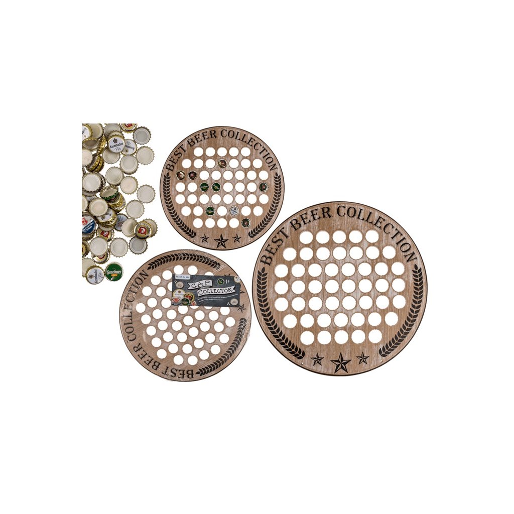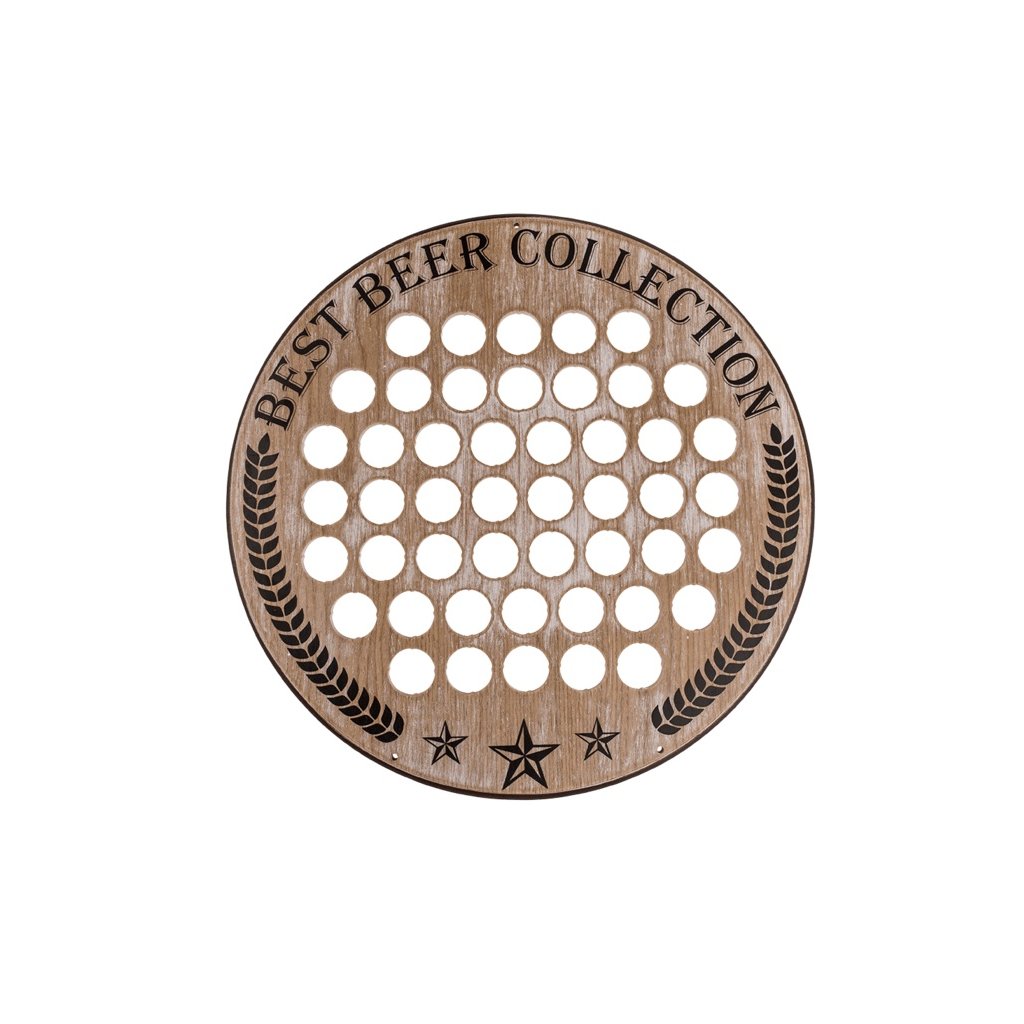 Fából készült kerek kupakgyűjtő, amely nagyszerű ajándék minden sörkedvelő számára.