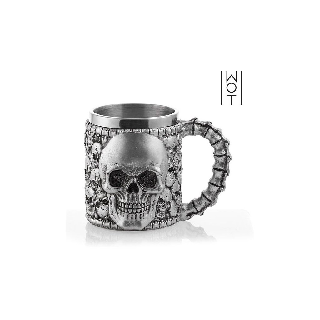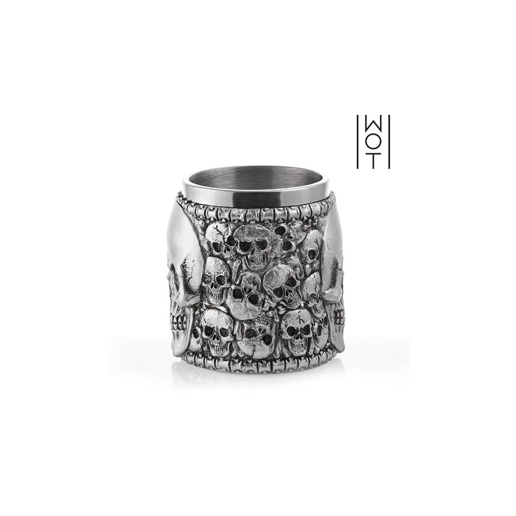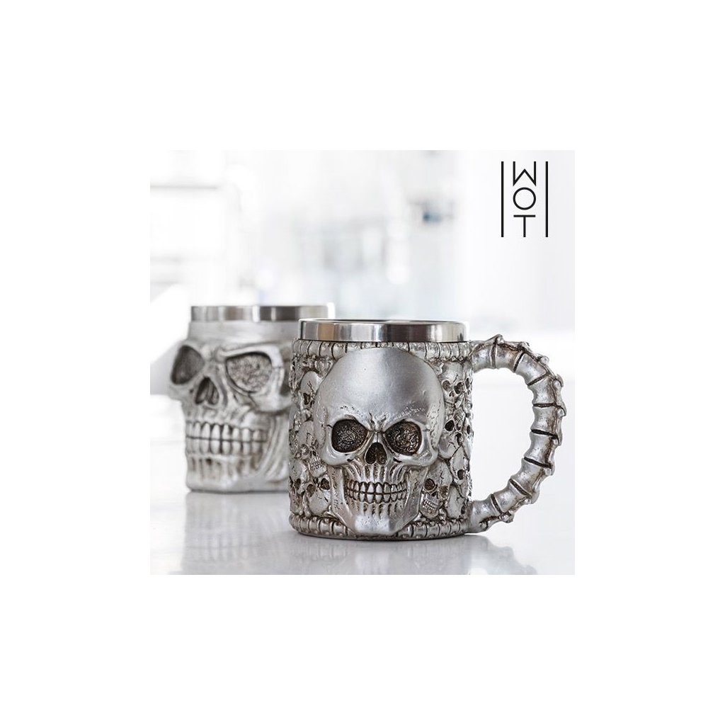 Ezüst színű bögre koponya díszítéssel, precíz kivitelezéssel.