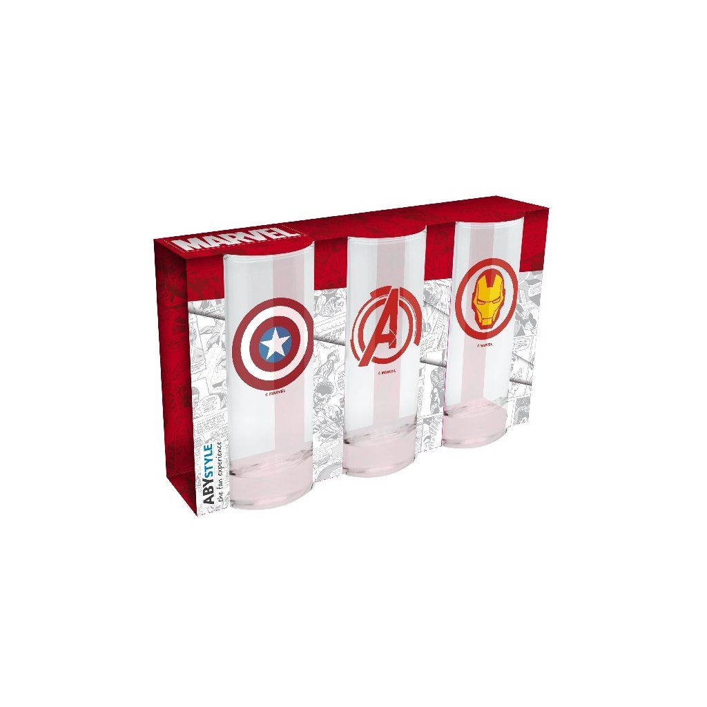 A szett 3 poharat tartalmaz a következő motívumokkal: Amerika Kapitány, Iron Man a Avengers.